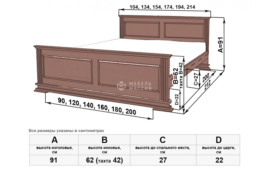 Для основательной конструкции кровати Венеция был выбран безупречный материал – натуральный древесный массив. Прочные изножье и изголовье доходят до самого пола, несколько расширяясь книзу и перетекая в устойчивые ножки. В интернет-магазине можно купить эту надёжную модель по самой выгодной цене. Осуществляется доставка на дом по Орску и Оренбургской области .| Размер | Цена | |