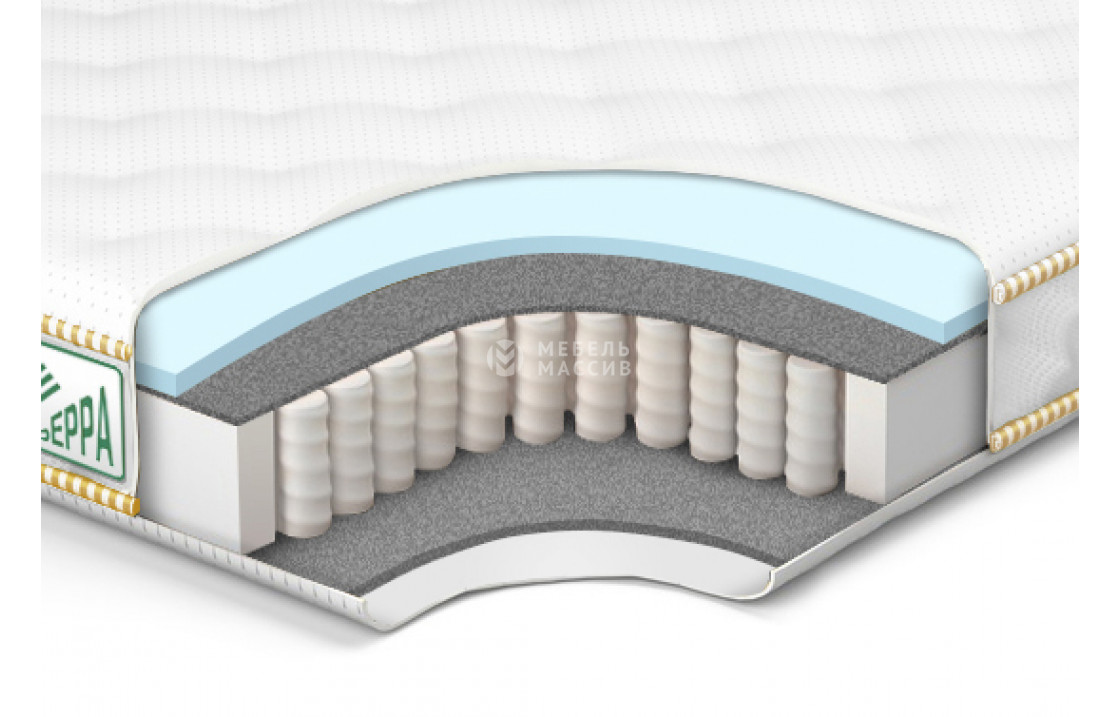 Блок независимых пружин - состоит из множества пружин имеющих форму бочонка, небольшого диаметра 5-6 см. Пружины изготовлены из проволоки. Они находятся в отдельных чехлах из очень прочного материала и скреплены термоспайкой, что позволяет идеально распределять нагрузку. Отдельная пружина реагирует на вес человека, вне зависимости от других, и матрас, повторяя контуры тела, позволяет оставаться позвоночнику ровным.