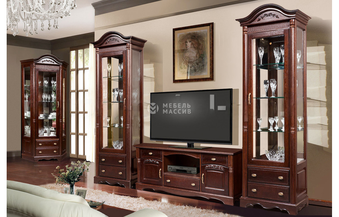 Для оформления гостиной комнаты был создан комплект Валео. Он состоит из двух небольших шкафчиков и тумбы под ТВ. Шкафы имеют стеклянные полочки за прозрачными дверками. На них можно расположить элитную посуду или элементы декора. Ниже имеются выдвижные ящики для хранения соответствующих аксессуаров. Тумба для ТВ имеет подходящую нишу для размещения в ней электроники. Мебель снабжена несколькими выдвижными ящиками и полочками за непрозрачными распашными дверками. В качестве украшения дизайнеры использовали резьбу по дереву и инкрустацию декоративными элементами. Доставка по Орску и Оренбургской области .| Размер | Цена | |