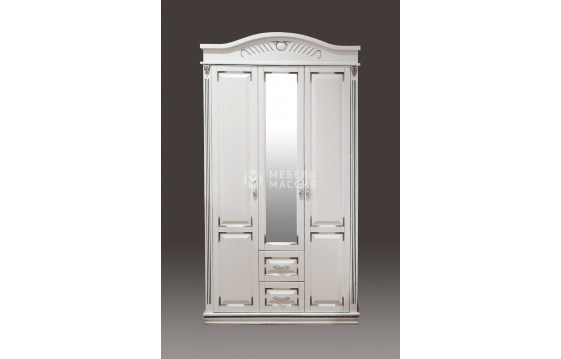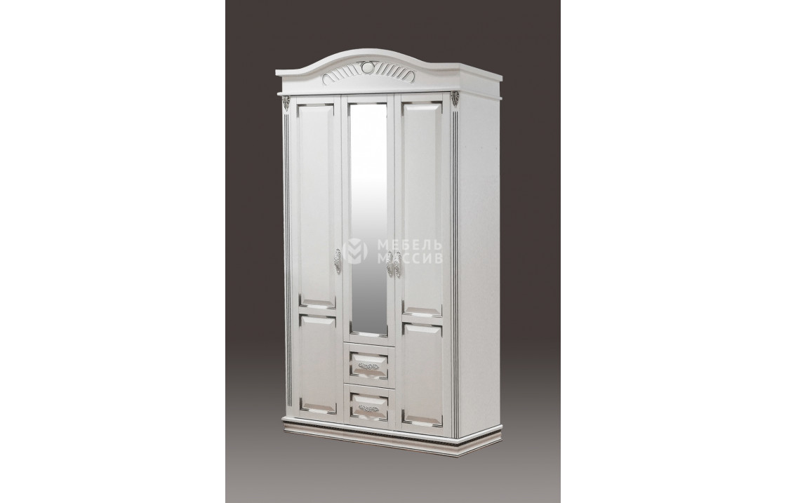 Шкаф Оливия Люкс из натурального древесного массива имеет три основных отделения для хранения, вертикальное зеркало и пару компактных ящиков для небольших аксессуаров. Отличительной чертой изделия, которое можно купить по лучшей цене в нашем интернет-магазине, является изысканный гнутый багет.